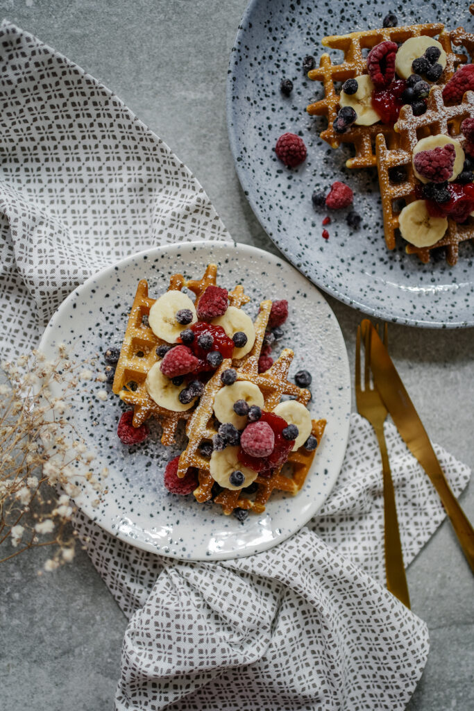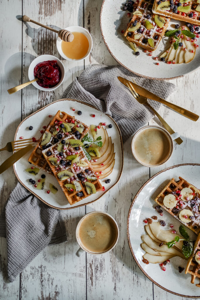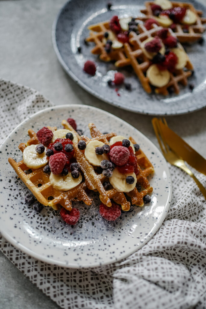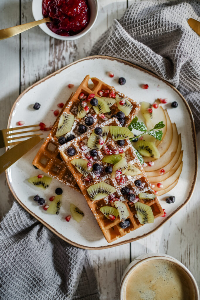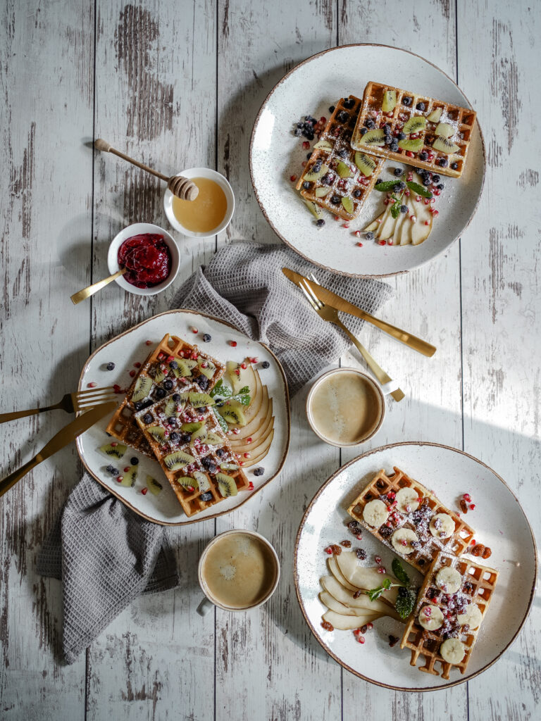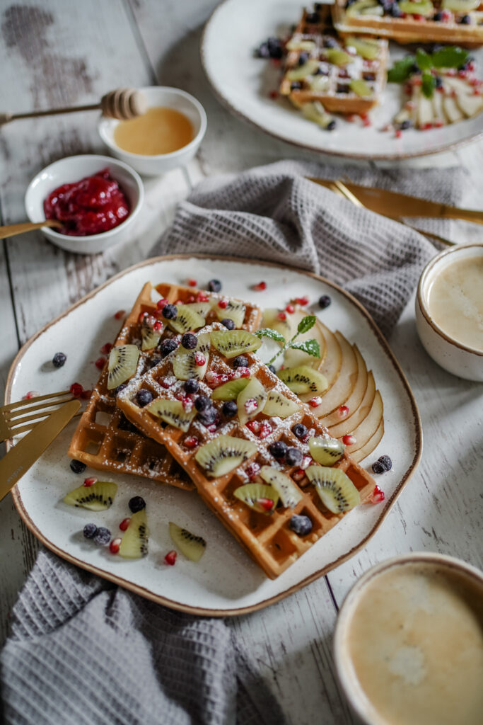 Moim zdaniem najlepsze połączenie to chrupiące gofry z owocami posypane cukrem pudrem. Kupiłam owoce, które są aktualnie dostępne – kiwi, granat, banan, gruszka i dodatkowo miałam zamrożone jagody i maliny. To połączenie dobrze smakuje również z syropem klonowym 🙂