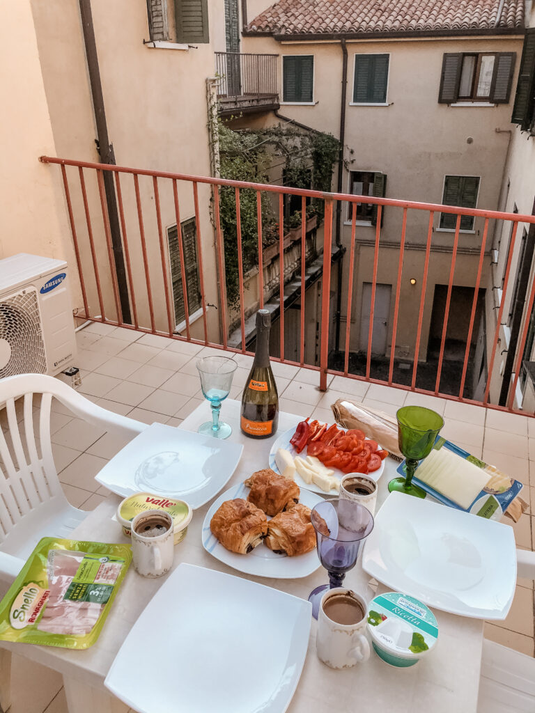 Nocleg rezerwowałam poprzez airbnb, w samym centrum miasta! Za całe mieszkanko zapłaciłam łącznie 202 euro (około 100zł za noc od osoby). Lokalizacja była naprawdę genialna, mieszkanie było tuż przy Arena di Verona, a do tego miałyśmy uroczy tarasik, na którym piłyśmy poranną kawkę i spędzałyśmy wieczory przy winku. Wnętrze mogłoby zostać trochę odświeżone, ale nie było tragedii 🙂