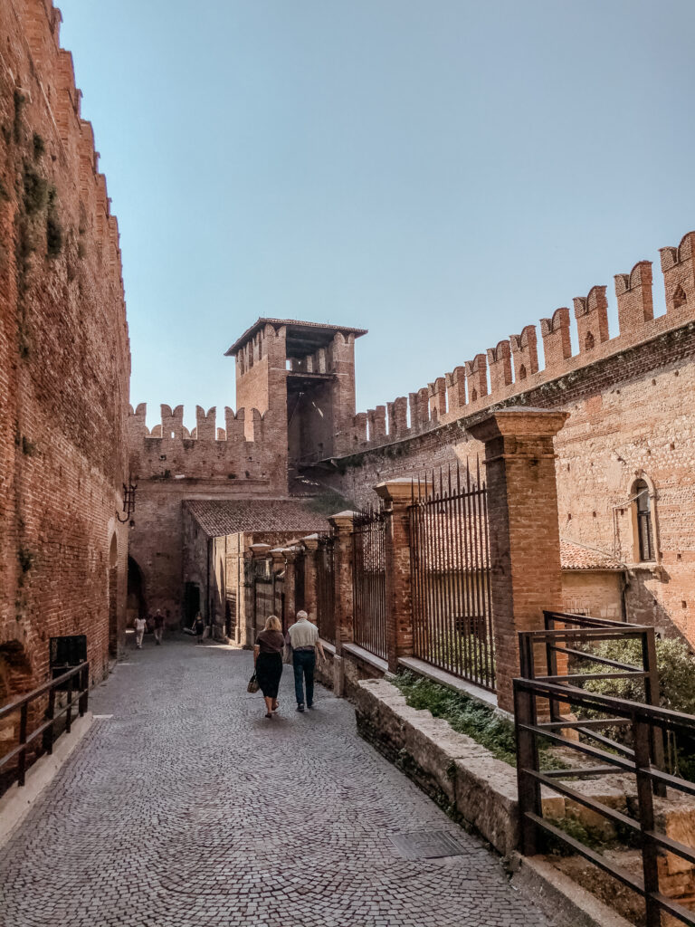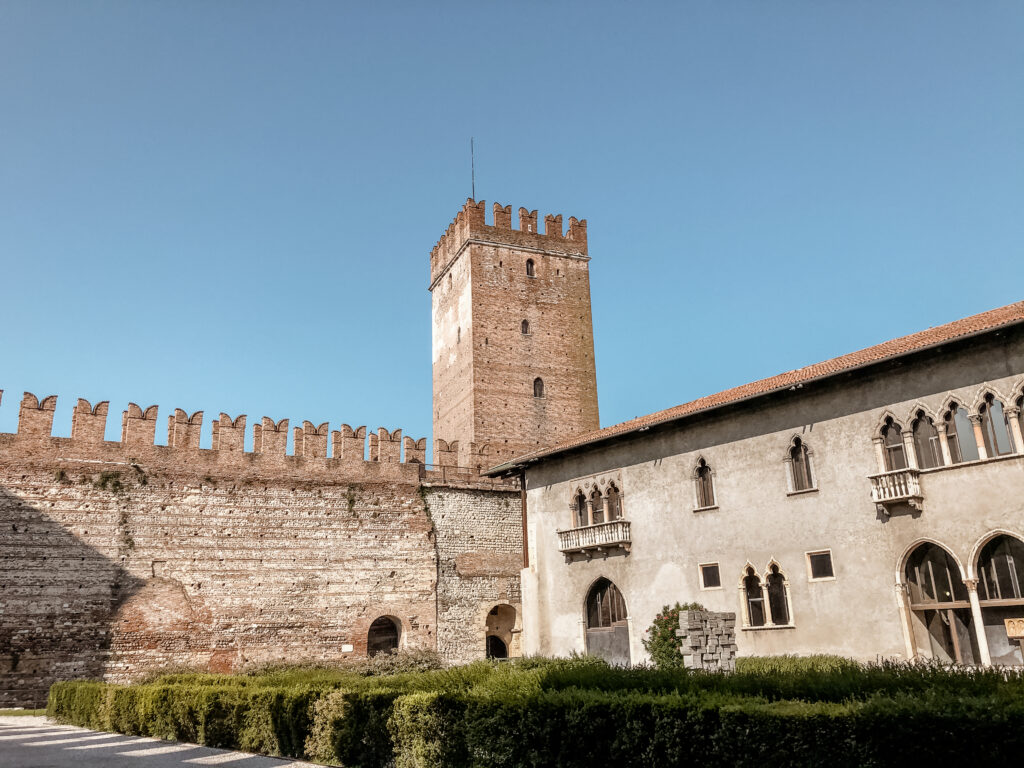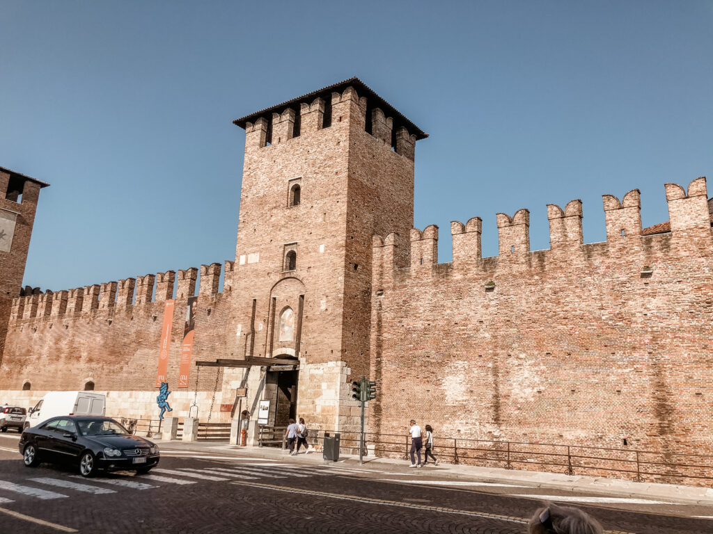 Budowa usytuowanego nad brzegiem rzeki Adygi zamku została zapoczątkowana w 1354 roku przez Cangrande II della Scala. W jego obręb włączono część murów miejskich. Budowla poddawana była licznym przebudowom, zatracając swój pierwotny kształt architektoniczny. W latach 1923-1926 zamek poddano gruntownym pracom restauracyjnym, przywracając mu stylizowany na średniowieczny wygląd. Na zamku mieści się muzeum.