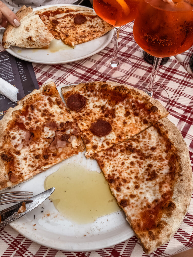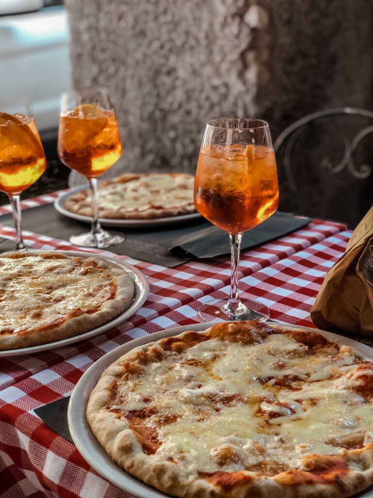 Krótka przerwa na pizzę i Aperola. We Włoszech większość knajp otwiera się dopiero na wieczór, pamiętajcie o tym, bo w ciągu dnia ciężko znaleźć miejsce na obiad, nam się udało dopiero za którymś razem. Dodatkowo do rachunku jest doliczane coperto, zależnie od miejsca jest to około 1-2 euro od osoby. Pizza z Aperolem i dodanym coperto to koszt około 15 euro od osoby.
